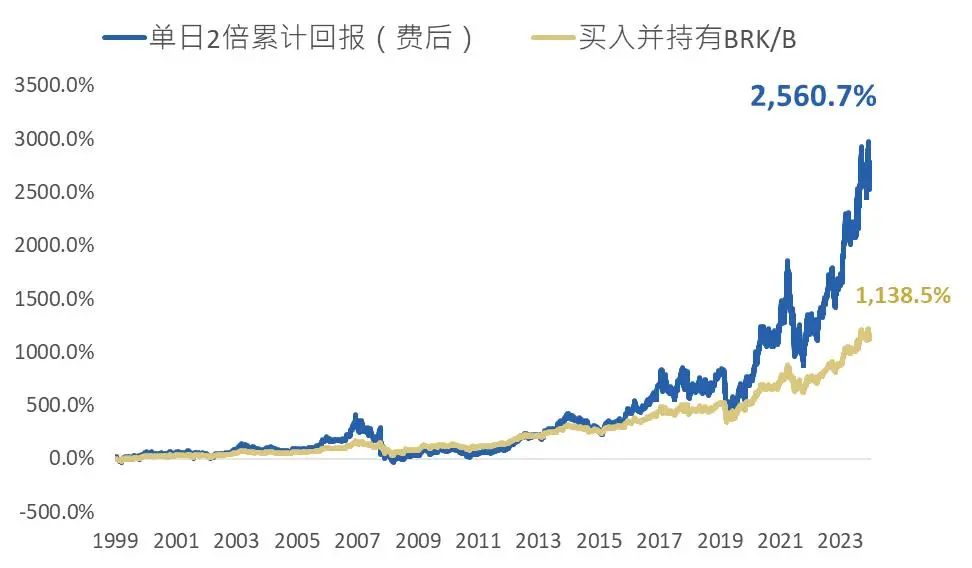南方东英Berkshire每日杠杆(2x)产品(或许是个特别的存在,因为它为投资者提供了加杠杆复刻“股神”投资组合的机会。 资料来源:彭博,南方东英。假设全年经常性开支比例为2%,此为模拟数据,仅用作说明用途,并非表示将来可获得的实际收益。产品并非为持有超过一日而设,因为产品超过一日期间的表现无论在数额及可能方向上都很可能与股票在同一期间的杠杆表现不同(例如损失可能超出股票跌幅的两倍)。